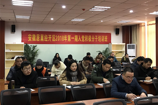 為進一步做好黨員發(fā)展工作,加強對入黨積極分子的教育培訓(xùn),2月1日,安徽居巢經(jīng)開區(qū)黨工委開展了為期兩天的2018年第一期入黨積極分子培訓(xùn)班,來自機關(guān)、園區(qū)企業(yè)的33名入黨積極分子參加了培訓(xùn)班。