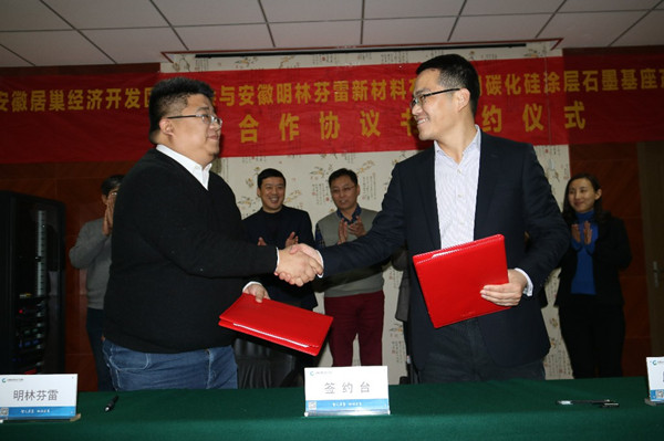 1月8日上午,安徽明林芬雷新材料有限公司與安徽居巢經濟開發區管委會成功舉行了碳化硅涂層石墨基座產業化項目投資合作協議簽約儀式,打響了2018年招商引資項目入駐的第一槍。