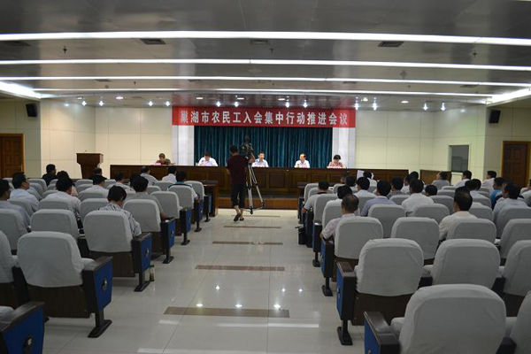8月13號下午,巢湖市農民工入會集中行動推進會議在市會務中心召開,合肥市總工會副主席戴建軍、市委副書記張生、市總工會主席朱蓮芳出席會議。市委常委、組織部長黃克忠主持會議。
