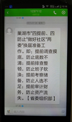 7月28日,我市城市社區“兩委”第三次統一換屆工作信息被省委組織部1237112采用。“巢湖市“四提前、四防止”做好社區“兩委”換屆準備工作。市委組織部提前下發專門通知,通過做到“提前調查摸底,防止底數不清;提前排查整頓,防止班子軟渙;提前考察儲備,防止人選不足;提前審計財務,防止資產流失”,為社區“兩委”第三次統一換屆工作奠定扎實的基礎。(省委組織部)”