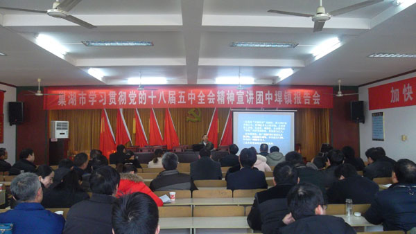 在宣講會上,巢湖市委十八屆五中全會宣講團(tuán)成員、巢湖市委黨校教研室主任何業(yè)明同志作了主題宣講報告。報告緊緊圍繞黨的十八屆五中全會精神,引古論今,用生動的實(shí)例,從十三五時期我國發(fā)展環(huán)境的基本特征、十三五時期我國經(jīng)濟(jì)社會發(fā)展的主要目標(biāo)和十三五時期我國經(jīng)濟(jì)社會發(fā)展的基本理念等方面對十三五規(guī)劃建議進(jìn)行了全面、準(zhǔn)確的分析和解讀。