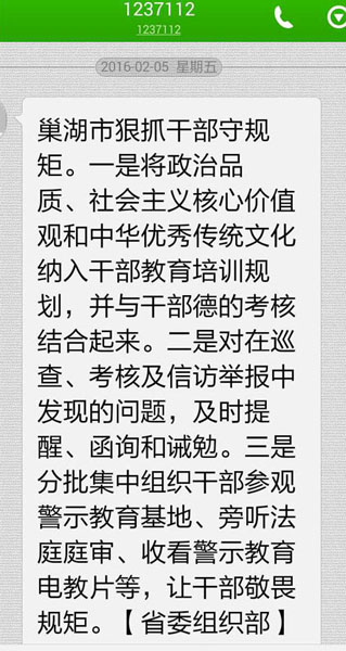 “巢湖市狠抓干部守規(guī)矩。一是將政治品質(zhì)、社會(huì)主義核心價(jià)值觀和中華優(yōu)秀傳統(tǒng)文化納入干部教育培訓(xùn)規(guī)劃,并與干部德的考核結(jié)合起來(lái)。二是對(duì)在巡查、考核及信訪舉報(bào)中發(fā)現(xiàn)的問(wèn)題,及時(shí)提醒、函詢和誡勉。三是分批集中組織干部參觀警示教育基地、旁聽(tīng)法庭庭審、收看警示教育電教片等,讓干部敬畏規(guī)矩。【省委組織部】”