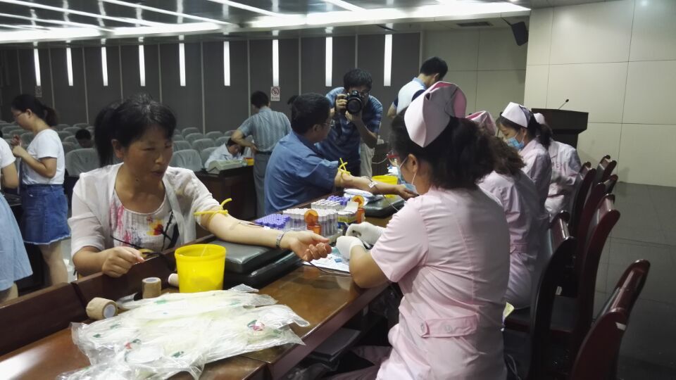 在活動現場,干部職工依次填表、測量血壓,接受醫生的體檢、化驗,并有序進行獻血,經檢測合格,3名干部職工成功獻血。