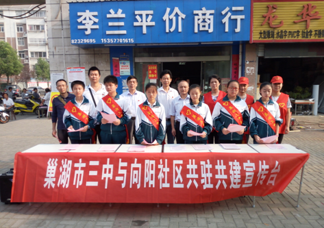 9月24日上午,在向陽(yáng)苑B區(qū)南大門(mén)舉辦了“巢湖市三中與向陽(yáng)社區(qū)共駐共建宣傳臺(tái)”暨“黨建惠民”區(qū)域化黨建聯(lián)盟活動(dòng),來(lái)自市三中、向陽(yáng)社區(qū)等單位的志愿者開(kāi)展了社會(huì)主義核心價(jià)值觀、環(huán)保進(jìn)社區(qū)、禁燃禁放、消防安全等多項(xiàng)“創(chuàng)城”宣傳活動(dòng)。