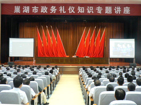 為進一步樹立機關干部良好的公眾形象,切實提高機關干部的對外開放能力,促進“產業高地、旅游勝地、生態之城”建設,加速實現“安徽爭五強、全國進百強”奮斗目標,近日巢湖市在政務中心舉行“巢湖市政務禮儀知識專題講座”。無錫市委黨校副校長鄧弋青教授應邀為大家授課。市四大班子全體負責同志、市法檢兩長以及市直單位、鄉鎮街道有關人員、市產業招商小分隊全體人員,近千人聆聽了講座。市委常委、組織部長、統戰部長王勁同志主持講座。