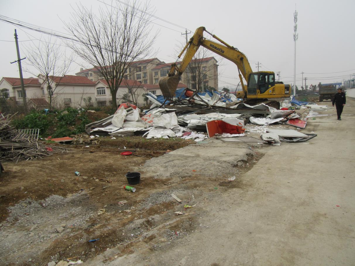 這處違法建筑為簡易移動板房,共五間。拆違隊員到達現場后,拉起警戒,清理、疏散、隔離圍觀群眾,對現場物品進行登記、拆除、清理、搬離。由于樓板系預制板構筑,隨即調來挖掘機現場施工。歷經3個多小時的緊張作業,這處違法建筑被順利拆除。