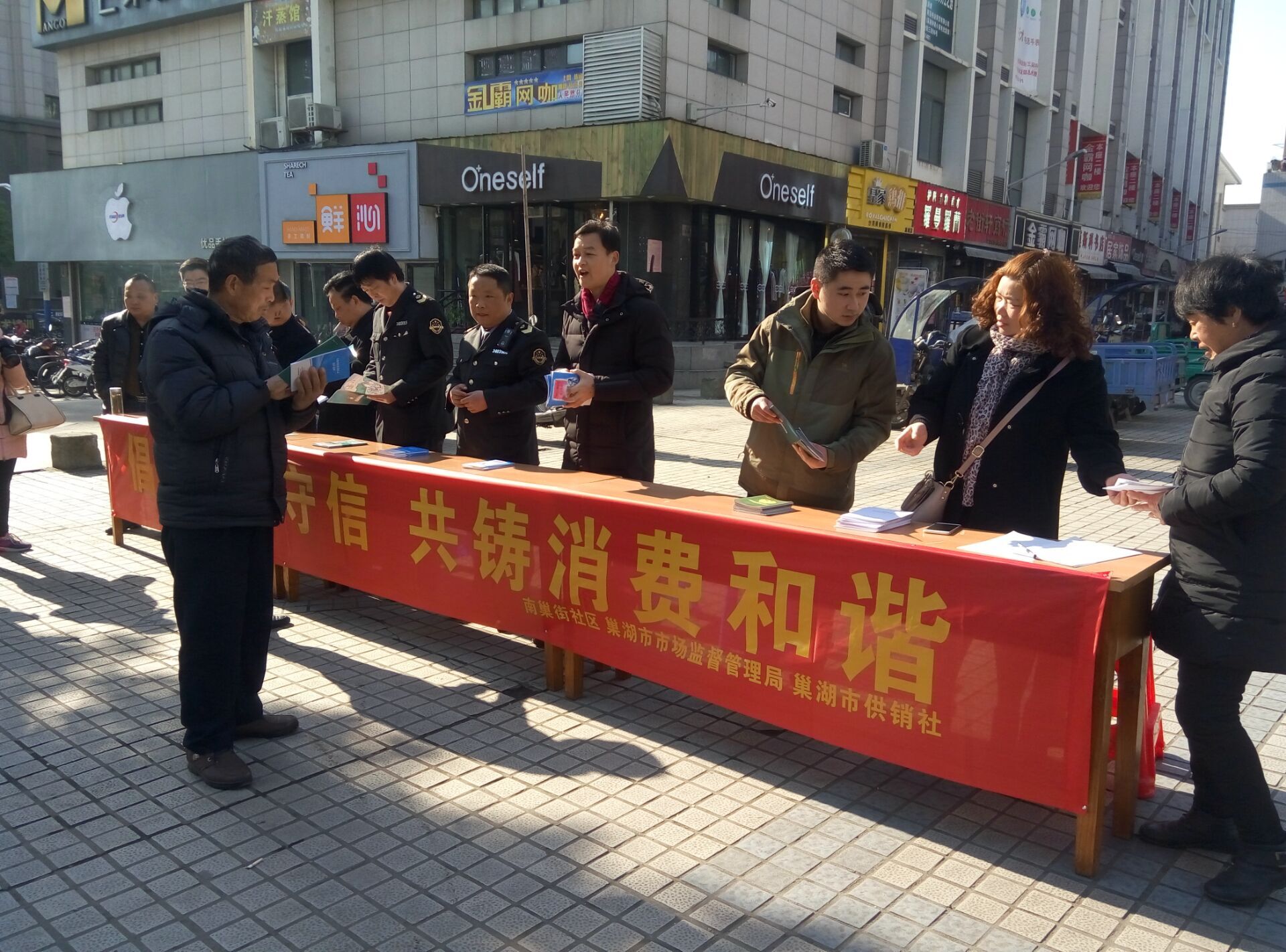買到假冒產品,如何打假?遭遇消費欺詐,如何拿起法律武器保護自己?在“315”國際消費者權益日來臨之際,為了讓居民們樹立新的消費觀念,臥牛山街道南巢街社區攜手巢湖市場監督管理局、巢湖市供銷社黨員志愿者在南巢商業街文化廣場開展了“倡導誠實守信、共鑄消費和諧”主題宣傳活動?!?span lang="EN-US">