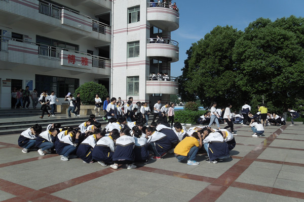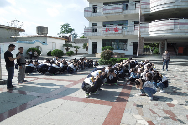 當天上午9:20,隨著校園廣播系統中一陣急促的警報拉響,各年級、各班級按照既定的“防震減災安全演練方案”進行防震避險演練。同學們在班主任和科任教師的指導下,用手護住頭和胸,就近或蹲或躲在課桌下,以避開地震開始時的強烈震動;當警報聲再次響起時,同學們在老師們的引導下按照預定的應急疏散路線雙手抱頭迅速而有序地從教室撤離到教學樓前空曠場地、運動場等應急避難場所;演練中所有老師都按時到達指定崗位,防止逃生時發生擁擠、踩踏和碰傷學生的事故發生,并在學生集結后迅速清點人數報告校長室。整個演練過程,用時不到2分鐘,秩序井然,達到了預期的演練效果。