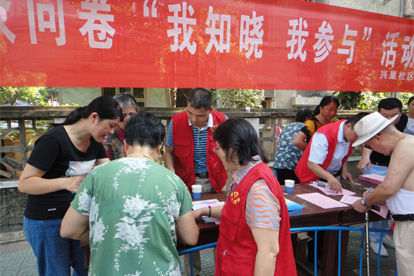 早晨7點,編辦、政務服務中心和興巢社區志愿者早早來到社區人流密集的小廣場,拉上“我知曉、我參與”活動橫幅,搭好宣傳臺,準備好肥皂、洗衣粉等小禮品。大家一邊宣傳創城知識,一邊指導社區群眾填寫創城測評問卷,對認真填寫問卷和留下姓名電話號碼的群眾給與小禮品獎勵。活動最后,志愿者還走進居民家中,開展入戶宣傳和測評活動。