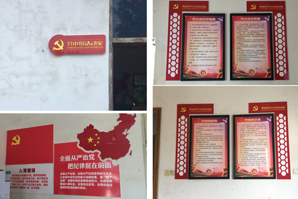 黨小組活動室進行統一氛圍設計,外墻醒目標注了“黨小組活動室”門牌,內部上墻了入黨誓詞、黨員權利、黨員義務、黨小組會議制度等制度牌。