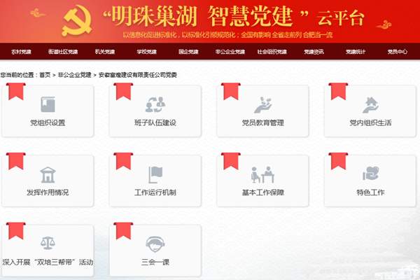 一是打造黨建云平臺,助力標準化建設。為進一步提升基層黨建工作科學化、規范化和信息化水平,結合基層黨組織標準化建設要求,巢湖市打造獨具我市特色的“明珠巢湖·智慧黨建”云平臺。目前,黃麓鎮已將富煌工業園區黨委管轄的13個支部納入“非公企業黨建”欄目中管理,要求各黨支部安排專人進行云平臺信息維護工作,同時鎮黨委定期組織督查更新情況。