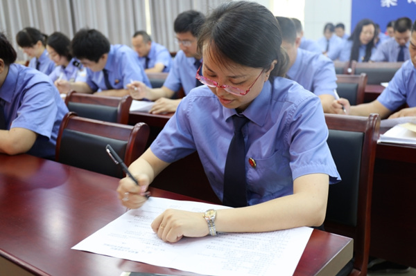 此次測試的內容以黨章、黨規及黨史知識和習近平總書記系列重要講話精神為主,采用書面答題的方式進行。測試過程中,每一位黨員都認真填寫答卷,力爭取得高分。測試結束后,院監察室主任現場向參加測試的黨員干警講解試卷題目,幫助大家查漏補缺,提升黨的理論知識掌握水平。