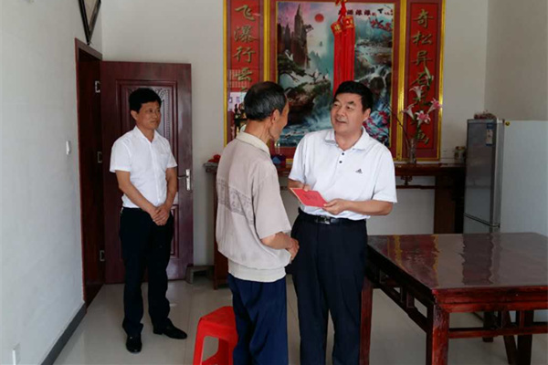 6月29日上午,合肥市委常委、巢湖市委書記胡啟生一行來到柘皋鎮合浦村、駟馬村,看望慰問生活困難的離任村干部劉朝興和低保貧困戶黨員於立凡。胡書記首先向他們致以節日的問候,親切地詢問他們的身體狀況、家庭收入,了解相關的幫扶措施和成效,并叮囑他們注意身體,要求村干部主動作為,多為生活困難的黨員群眾排憂解難,想他們之所想,急他們之所急。