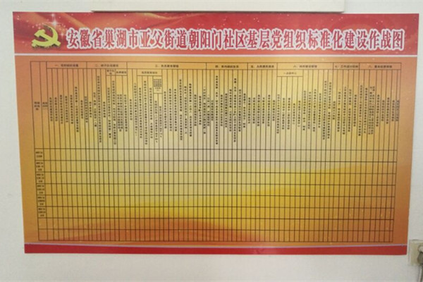 為扎實推進基層黨組織標準化建設,高標準、高效率完成達標任務。近日,亞父街道黨工委將基層黨組織標準化建設達標八大項、72個任務制作成分解表,街道和所屬村居黨組織將分解表分別上墻,實現掛圖作戰。