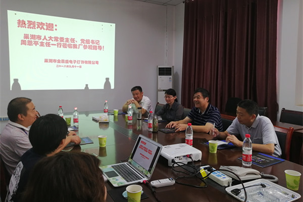 潘春燕代表是巢湖市金鼎盛電子燈飾有限公司的副總經理,在金鼎盛公司的座談會上,周恩平一行認真聽取了該公司2018年1-8月份以來運營情況,產品銷售及存在問題,對政府及有關部門的建議等,對該公司所做貢獻及承擔的社會責任表示滿意,并指出,人大代表不僅是一種榮譽,更是一種責任。作為企業代表,要處理好代表與工作關系,在做好本職工作的同時,深入基層、企業開展調查研究,了解情況,充分做好人代會會前準備,為實體經濟發展建言獻策,不辜負全市人民的期望和重托。
