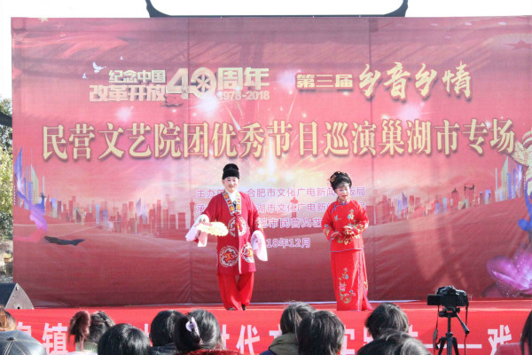 為紀念改革開放40周年,12月19日,由合肥市文廣新局主辦,巢湖市文廣新局和市民營文藝院團協會承辦的合肥市第三屆“鄉音鄉情”民營文藝院團優秀節目巡演在美麗的柘皋鎮汪橋村開演。