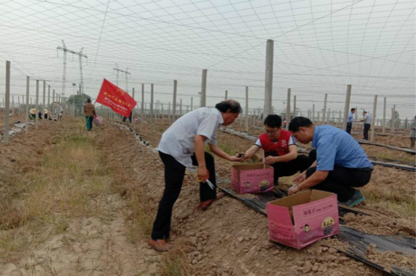 在駟馬村瓜蔞扶貧產業園,黨員志愿者們在技術人員的指導下,和在此產業園務工的貧困戶分組行動,分發種苗、栽種苗木、澆灌營養液等,邊學邊干,勞動場面熱烈。