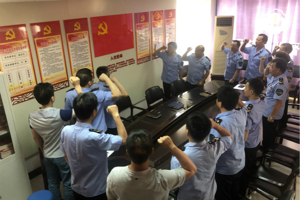 二是重溫入黨誓詞。組織全體黨員面對黨員活動室宣誓墻,重溫入黨誓詞:“我志愿加入中國共產黨,擁護黨的綱領,遵守黨的章程……永不叛黨”。通過宣誓,激勵每名黨員干警爭先創優,發揮先鋒模范帶頭作用,堅定為共產主義事業奮斗終身的信念。