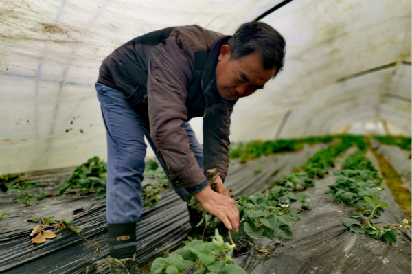 “這些多余的枝葉、病葉都要去掉,果實會更飽滿。”種植戶李宗水正在棚內(nèi)摘掉藤上的老枝黃葉,小心打理著草莓。該大棚的創(chuàng)業(yè)者就是李宗水和80后的兒子李瑞。