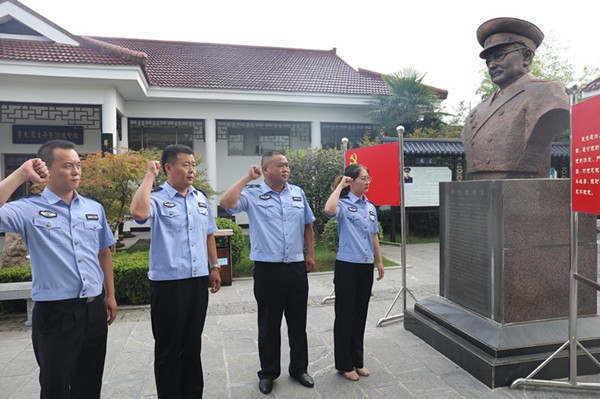 大家首先在院內李克農同志雕像前,面對黨旗,舉起右手,重溫入黨誓詞;隨后進入故居內陳列廳參觀。廳內列有李克農生平事跡圖片190余幅、革命文物50余件和大量的文獻資料,并運用聲、光、電、多媒體等現代技術手段,多方位全景式的展示了李克農傳奇的一生。干警們或駐足觀看,認真聆聽講解員講解,或拿起手機拍下櫥窗內的珍貴照片。