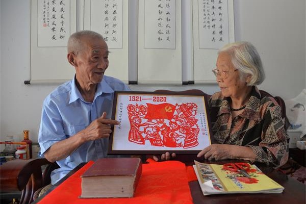 王俠夫、梁朝娥夫婦展示他們創作的“歌頌偉大的中國共產黨”剪紙作品。