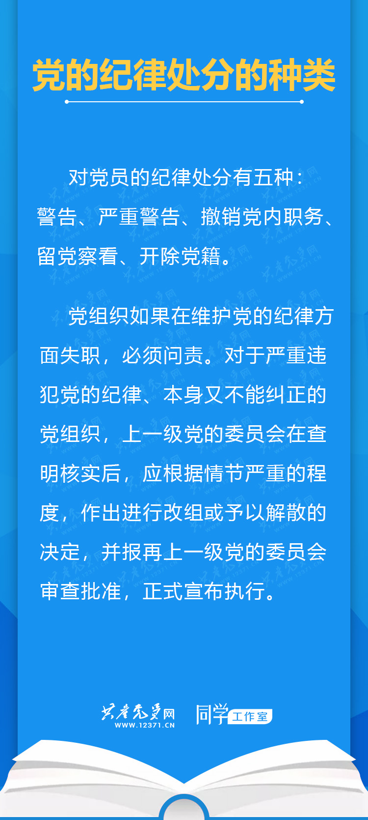 對(duì)黨員的紀(jì)律處分有五種:警告、嚴(yán)重警告、撤銷黨內(nèi)職務(wù)、留黨察看、開(kāi)除黨籍。