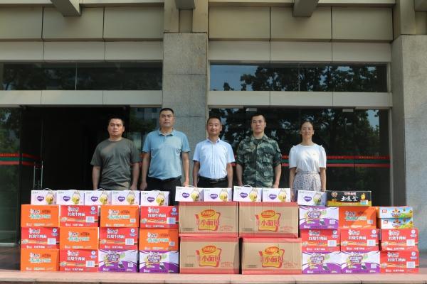 隨后,街道一行工作人員將牛奶、方便面、大米、食用油等防暑降溫飲品送至官兵手中。