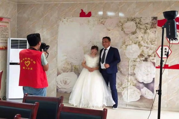 本次活動(dòng),是免費(fèi)為五星社區(qū)的退役軍人、老黨員家庭拍攝婚婚紗合影和照或全家福。拍攝過程中,志愿者們精心為老人們挑選婚紗、禮服,佩戴頭飾,化妝。他們換裝打扮后,各個(gè)神采奕奕,眼中泛著光芒,好像又回到那個(gè)妙齡少女和翩翩少年的時(shí)代。