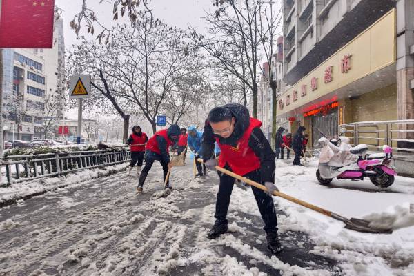 大家冒著凜冽的寒風、紛飛的大雪,有的揮動鐵鍬除冰,有的拿著掃帚掃雪,有的手提塑料桶揚鹽……盡管凍得手臉通紅,但絲毫沒有影響大家鏟雪除冰的熱情和工作效率,一個個干勁十足的身影在皚皚白雪中構成了一道道靚麗的風景線。經過大家的相互配合、通力協作,積雪清理成效明顯。街道轄區內人行道、背街小巷、主次干道出入口、公交站臺、住宅小區、街居便民服務大廳周邊等區域大面積積雪全部鏟除,為居民清理出一條條“暢通路”“放心路”。同時,街道高度重視大雪天氣下農業果蔬大棚種植戶和困難弱勢群體情況,組織人員及時開展走訪排查、清雪掃雪、關心關愛活動,確保居民生產生活安全。此外,街道通過居民微信群、短信平臺等方式做好極端天氣宣傳工作,加大氣象預報預警信息傳播,及時宣傳低溫防范措施及注意事項,提高群眾自我保護意識,引導居民采取保暖防御措施。