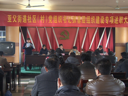 亞父街道黨工委根據市委組織的統一布暑安排,于2012年11月28召開社區、村黨組織書記抓基層組織建設專項述職大會,就一年來社區、村黨組織書記履行抓黨建工作職責情況進行民主評議測評,以此推動基層黨建工作上臺階、升水平。