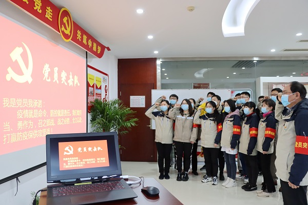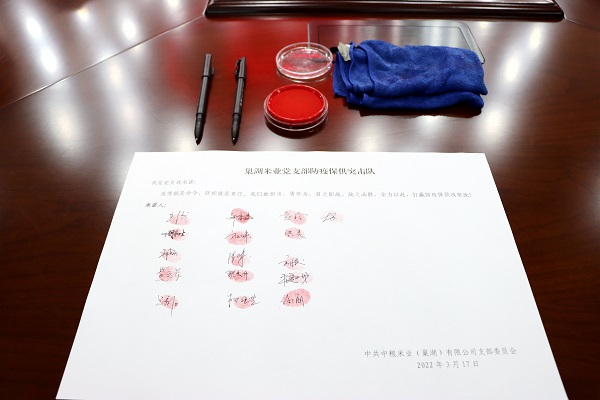 該經開區中糧米業(巢湖)有限公司黨支部16名黨員骨干主動請纓,紛紛在承諾書上簽字、在黨旗前宣誓;突擊隊隊員承諾要爭做戰疫“急先鋒”,積極參與健康碼核驗、測溫信息錄入、防疫物資保障等工作;要主動與相關部門溝通,暢通綠色物流環節,切實承擔保供主體責任。