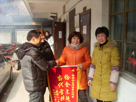 22日上午為感謝她們的高尚行為,失主特意來到南巢街社區向她們送上錦旗。(臥牛山街道 陳剛 張勇)