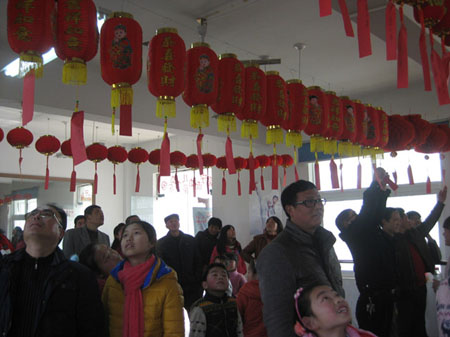 文化站一樓寬敞的大廳里,上百只造型別致的紅燈籠高高掛起,充滿著歡樂喜慶氣氛。每只燈籠下面貼著一張紅紙條,上面寫有一謎語,有猜動(dòng)物的,有猜字謎的,有猜生活用品的,內(nèi)容十分豐富。根據(jù)游戲規(guī)則,猜謎人只要猜對(duì)哪只燈籠上的謎語,就可得到一份精美的獎(jiǎng)品和那只漂亮的紅燈籠。大家興奮地徘徊在燈籠陣前,賞著燈籠,猜著謎語,或獨(dú)自沉思揣測(cè),或三兩探討交流,神情十分投入。伴隨著歡聲笑語,“我猜到了!”的聲音此起彼伏。“恭喜你,猜對(duì)了!”主持人一邊解釋謎面,一邊將獎(jiǎng)品和紅燈籠遞到獲獎(jiǎng)人手中。隨著時(shí)間的推移,一個(gè)個(gè)謎語被人猜中,一只只紅燈籠被人拎走。活動(dòng)持續(xù)2個(gè)小時(shí),當(dāng)主持人宣布有獎(jiǎng)猜謎燈會(huì)圓滿結(jié)束,人們才捧著獎(jiǎng)品,拎著紅燈籠,意猶未盡地離開現(xiàn)場(chǎng)。