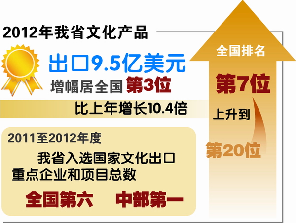 2012年全省文化出口額9.5億美元,同比增長10.4倍,位列全國第7位;龍頭文化企業“海外沖浪”、民營“小巨人”巧打創意牌,我省入選2011至2012年度國家文化出口重點企業和項目總數位列全國第六、中部第一。