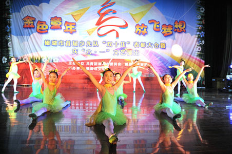 以“金色童年,放飛夢想”為主題的專場文藝演出由市少年宮承辦,演出在合唱《中國 中國 我愛你》的歌聲中拉開序幕,節目內容豐富多彩,有舞蹈、民樂小合奏、小合唱、詩朗誦、二胡合奏等,展現了孩子們健康向上、全面發展、多才多藝的風貌,體現了“紅領巾相約中國夢”的時代精神。小朋友們也用他們可愛的造型和自信的表演贏得了觀眾的陣陣掌聲。