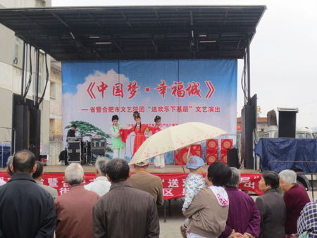 據負責人介紹中國夢幸福城歡樂下基層巡演活動,以合肥市廬劇團的演員為主體,充分發揮地方戲曲的優勢,面向廣大人民群眾,組織了一批廬劇優秀傳統劇目和包括《包公趕驢》《游園觀畫》等這樣的新編劇目,來豐富社區居民的精神文化生活。